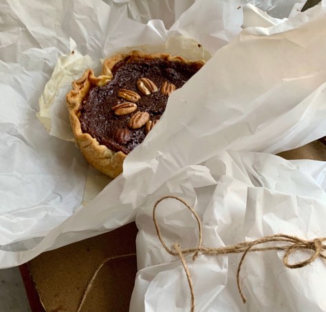 Think twine, muslin, brown paper bags and tags (stamped with a logo?) that’s a good starting point. I also love crisp cello wrap for almost anything. And honestly old fashioned wax paper uplevels even the simplest fare. That chocolate pecan pie? I wrapped it in parchment tied with natural twine. Somehow the pie seemed more homemade and more delightful!