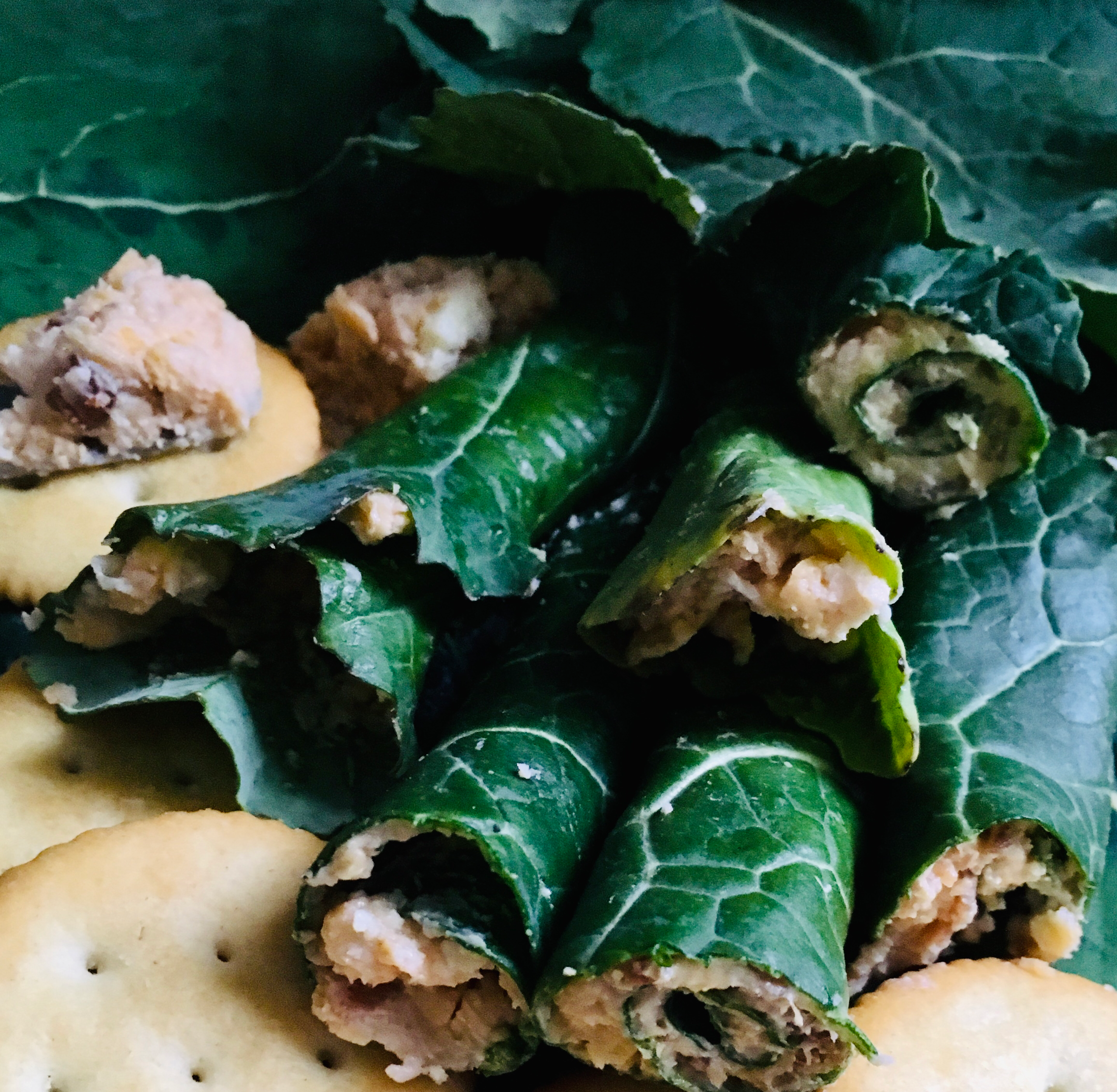 Collards are a favorite in the Deep South. I took some tender leaves, smeared on a cheddar, blue cheese/ pecan mixture; rolled them up. On a grazing board they were amazing- no cooking required. For the recipe- it’s called Camellia’s Bleu Pig A similar thing could be done with kale or chard- which is so beautiful.