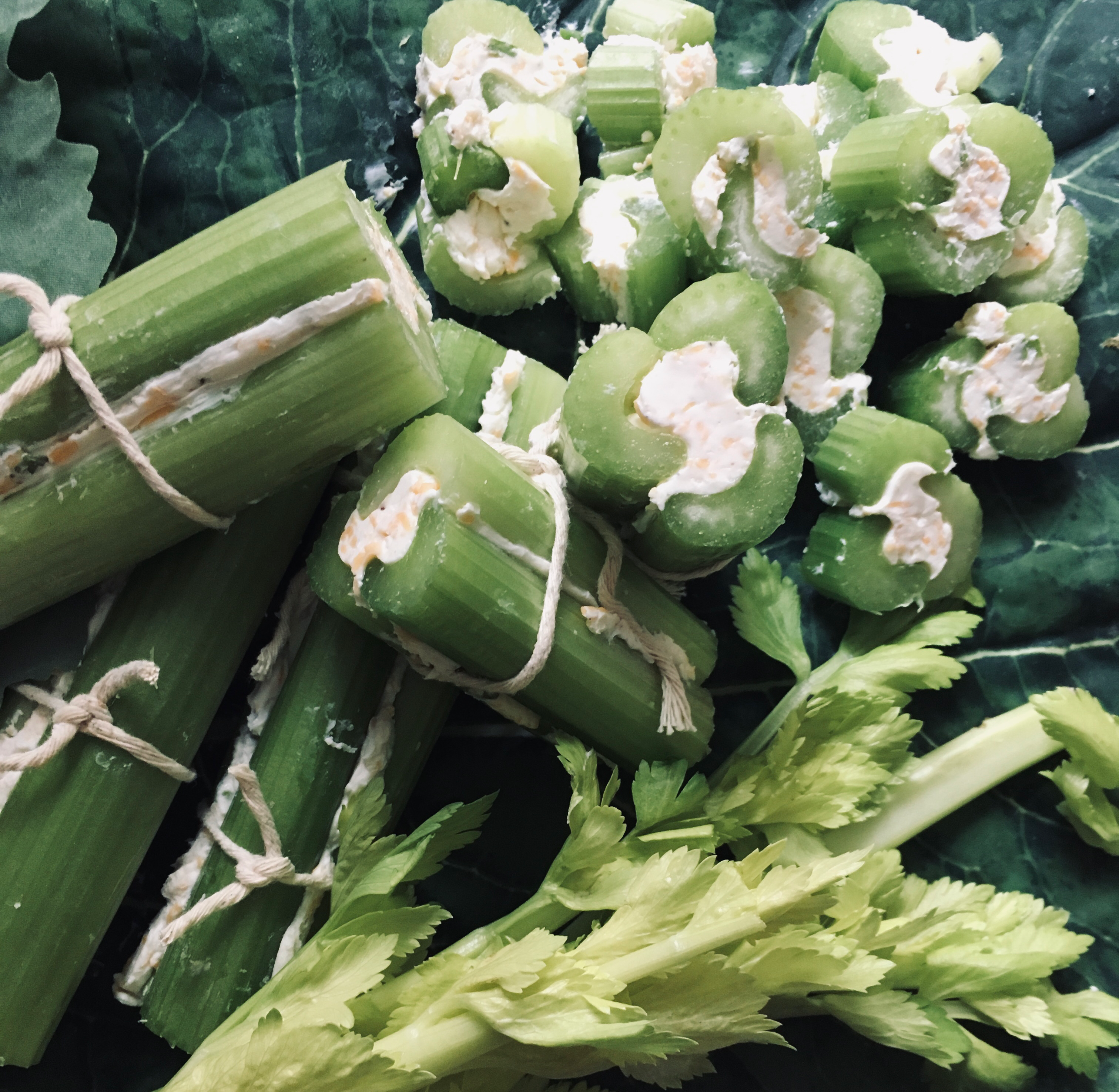 A staple green vegetable here, is the ever present Celery. Take a look at them- filled with a soft cheese mixture- then three stalks are pressed together Tied into bundles and chilled, it’s another addition to a charcuterie board. When sliced, they turn into Camellia’s Celery Blossoms It’s amazing what a bit of crunch can do, look how pretty and fresh these simple blossoms are!