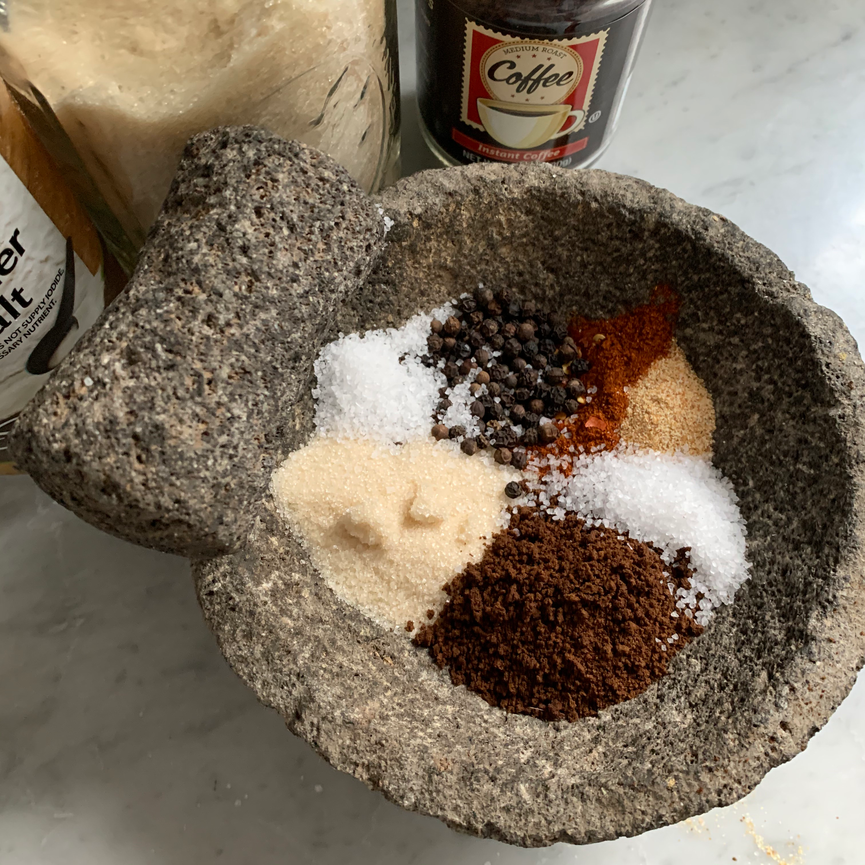 1-2 Tablespoons Granular Coffee 3-4 Tablespoons Kosher Salt 1-2 Tablespoons Black Peppercorns 1 Tablespoon Paprika 1/2 – 1 Teaspoon Cayenne Pepper (optional) 1 Teaspoon Garlic Powder 1-2 Tablespoons Pure Cane Sugar