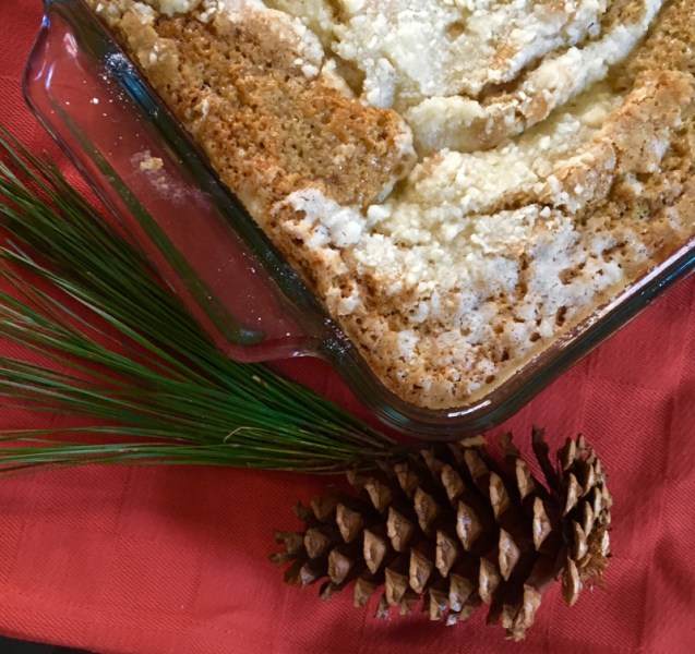 I have lots of recipes scribbled on lined paper- I’m never sure where I found these recipes or why I’ve kept them… I ran across this one called -Gingerbread Crumb Cake. To be honest it isn’t as dark as a true gingerbread. Still. It does have warm gingerbread spices- as it bakes, the scents wafting through the house bring holiday cheer. This Crumb Cake is a standout for the holidays. It doesn’t hurt that it’s easy to make, keeps well and best of all is great for drop in company or gift giving. Gingerbread Crumb Cake really doesn’t call for extra special ingredients, so you can whip one up when the notion strikes!
